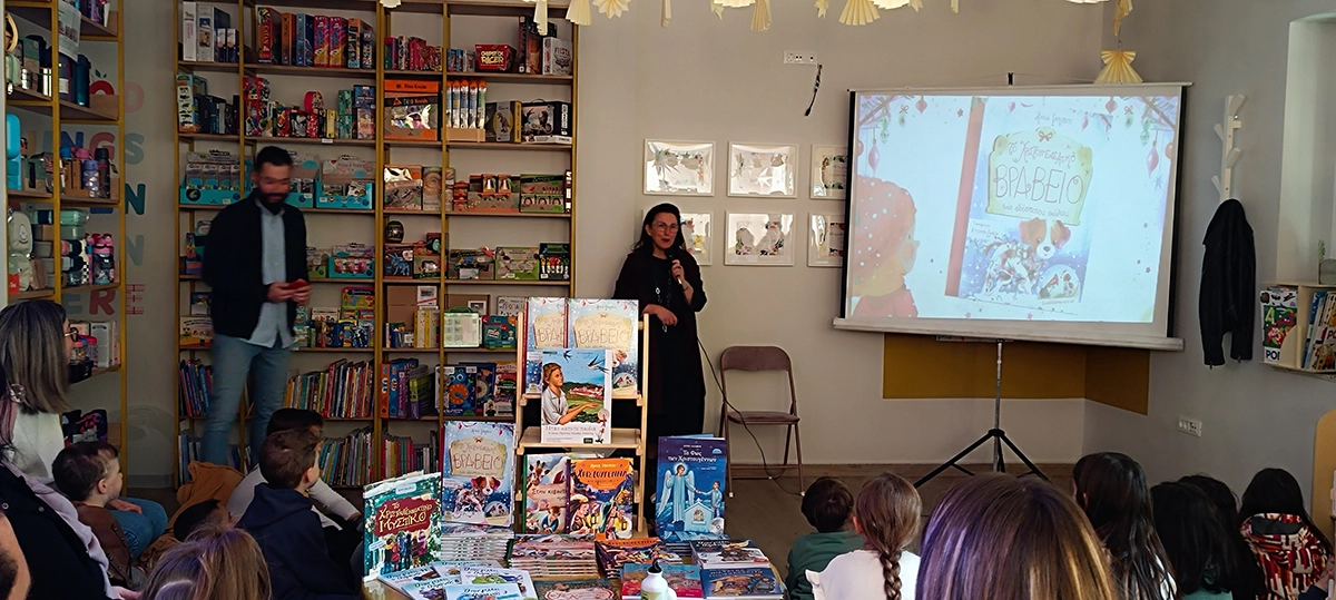 Η συγγραφέας Άννα Ιακώβου αφηγείται το βιβλίο “Το Χριστουγεννιάτικο Βραβείο ενός αδέσποτου σκύλου” στο βιβλιοπωλείο Κουκουβάγια στη Σπάρτη.
